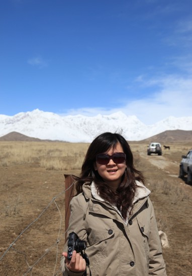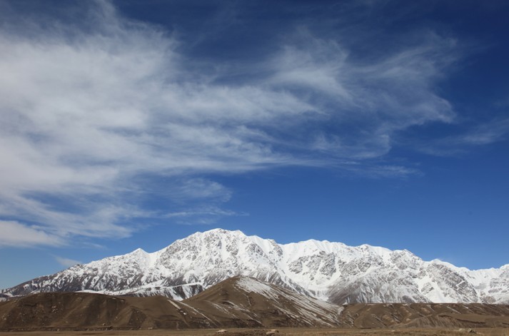 一路上虽然颠簸不堪、尘土漫天,甚至还遭遇了车子熄火推车,却丝毫不影响我们飞扬的心情。车子出了市区,拐上小路,穿越峡谷,峡谷两边是陡峭的山崖,据说全是雪山融化的水冲蚀出来的,不得不感叹大自然的力量!驶出峡谷干涸的河道,来到戈壁滩,只有一条羊肠小道蜿蜒向前,两边是散乱分布的荆棘,偶尔可见羊群、牛马、骆驼、牧民的帐篷和砖房点缀其间。大概一个多小时后,雪山出现在眼前,越靠近雪山天越蓝,空气越清冽,仿佛经过了过滤。整个山脉有一条整齐的雪线分隔,上面是雪白的山峰,下面是红褐泛黄的山体,远看仿佛是两座重叠的山脉。