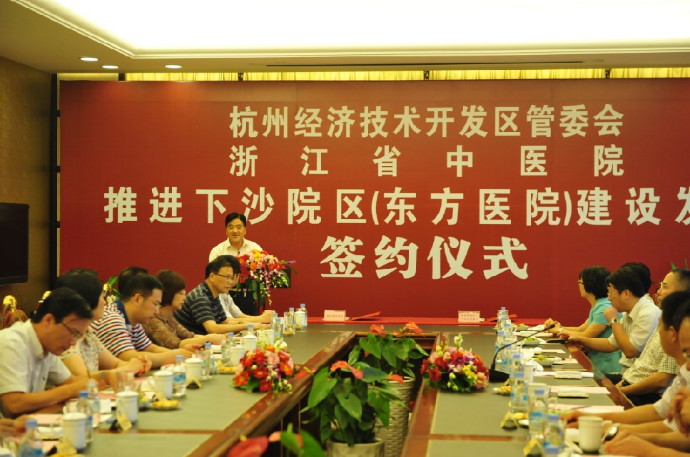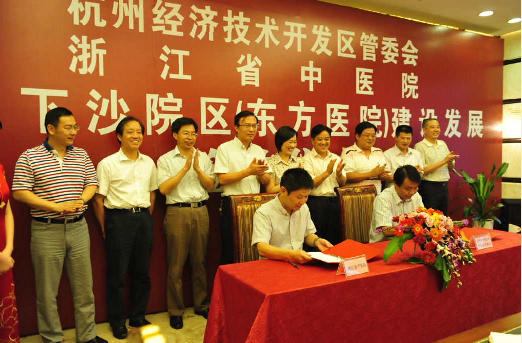 9月7日,杭州经济技术开发区管委会和浙江省中医院就推进下沙院区(东方医院)建设发展事宜签订协议。杭州经济技术开发区管委会党工委书记盛成皿、主任陈晨、副书记俞建国、副主任何铨寿,浙江省卫生厅副厅长张平、浙江省中医药管理局局长徐伟伟,浙江中医药大学党委书记孙秋华、校长范永升、党委副书记黄文秀、党委副书记熊耀康、副校长李俊伟、纪委书记茹惠祥,省发改委、省财政厅、开发区各相关处室领导和我院党政领导班子全体成员出席了签约仪式。仪式由开发区管委会党工委副书记俞建国主持。