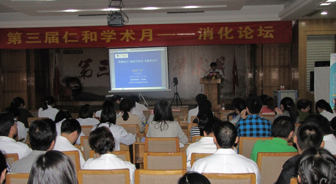 10月19日,“浙江省中医院第三届仁和学术月开幕式暨消化高峰论坛活动”在我院多功能厅正式拉开帷幕。德克萨斯大学医学分部消化科临床生理学实验室主任陈建德教授、华中科技大学同济医学院副院长侯晓华教授、我院院长吕宾、副院长沈敏鹤以及相关医务人员200余人参加了开幕式。开幕式上,吕宾院长代表医院向来宾表示了欢迎,他指出,前两届“仁和学术月”的成功举办,在促进医院学术氛围,提高学术水平上取得了良好成效。本届“仁和学术月”活动以“传承、创新、发展、共赢”为主题,旨在进一步浓厚学术研究氛围,推动学术创新发展,提高医院学术声誉和影响力,不断扩大医院学术成果。医院将通过学术讲座、手术演示、病历讨论和健康宣教等多种形式为广大的临床医务工作者提供一个启迪思维、分享经验、建立友谊和发展共赢的平台。同时,医院还将邀请国内外知名专家、学者与我院专家一起进行学术交流,促进医学理论、医学技术的发展,促进健康知识的传播,促进医学人才的培养。