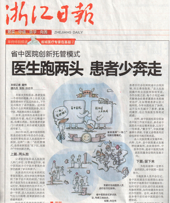 2013年10月,省中医院和松阳县启动为期5年的合作办医,全面托管松阳县人民医院和中医院,这种“一拖二”的托管模式,是我省新医改“双下沉、双提升”中的创新之举。