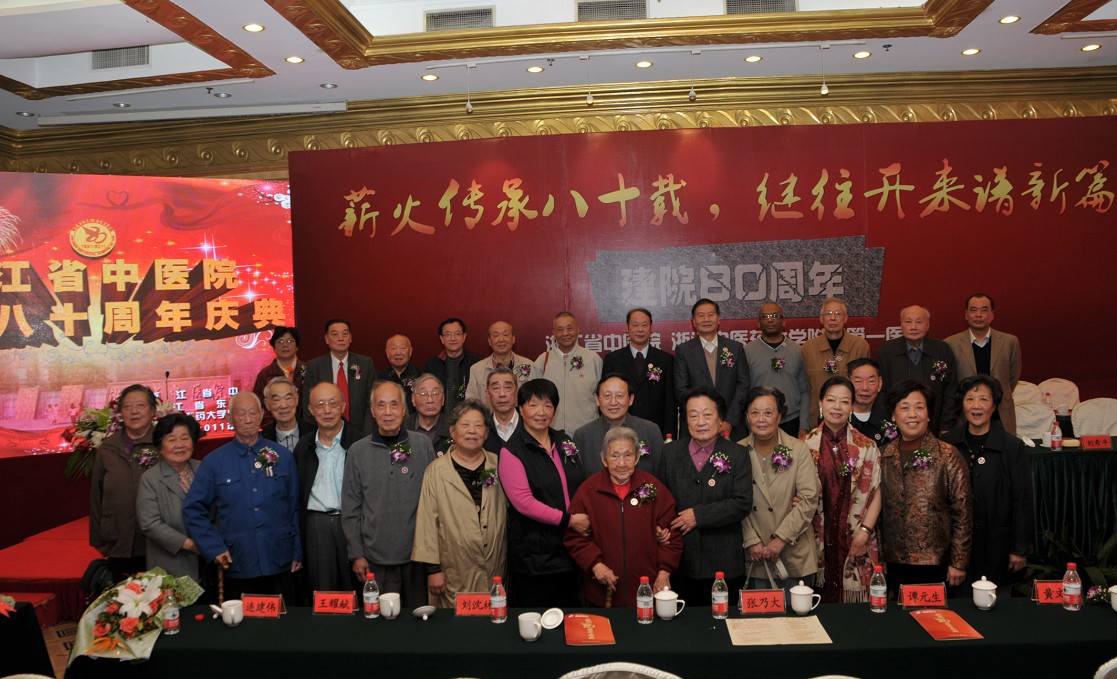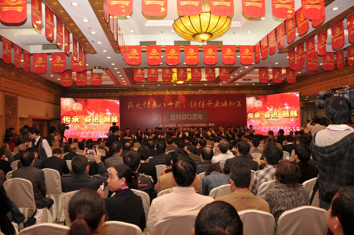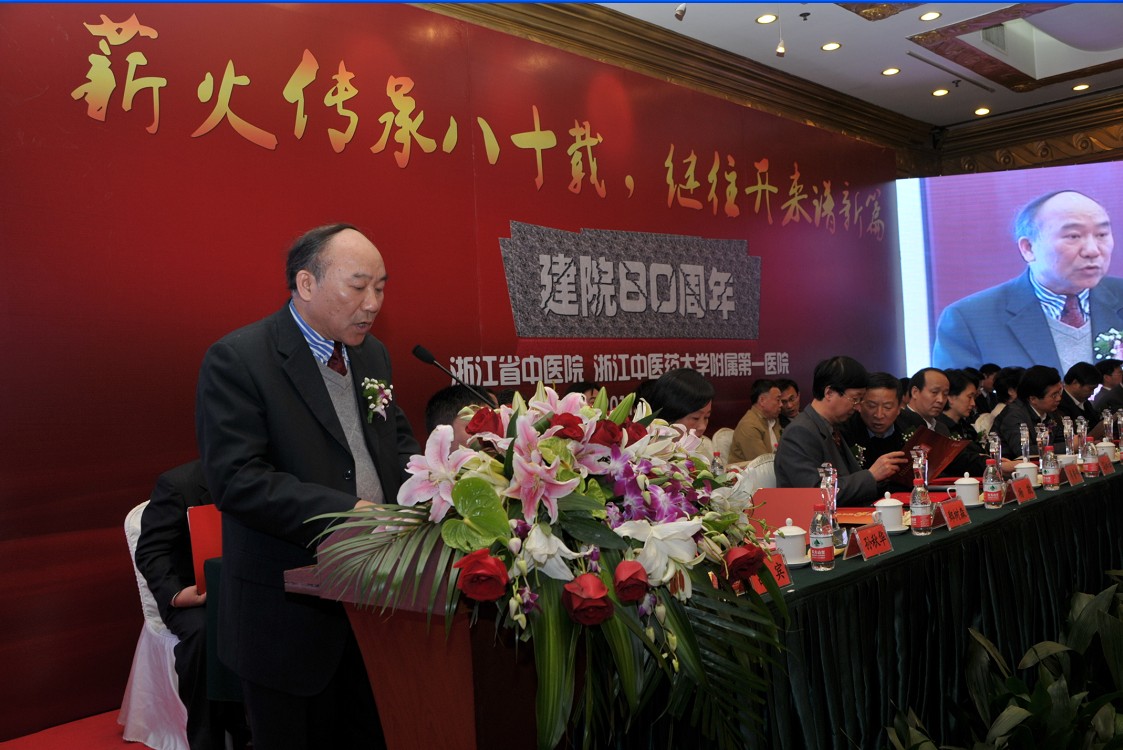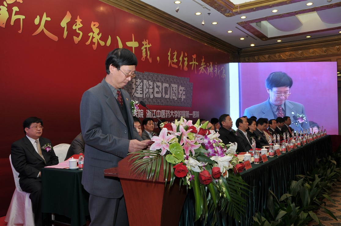 大学附属第一医院)在新侨饭店桂宫隆重举行了建院八十周年庆典。省委书记、省人大常委会主任赵洪祝、卫生部部长陈竺等发来贺信。省人大常委会副主任冯明、省政府副省长郑继伟,省政府副秘书长马林云,省人大常委会科教文卫副主任肖鲁伟,浙江省教育厅厅长刘希平,省卫生厅厅长杨敬,浙江中医药大学党委书记孙秋华,校长范永升等领导等出席了庆典。省、市、区有关部门的领导,浙江中医药大学党政班子领导以及省内外兄弟单位、对口支援单位嘉宾、国际友人和本院干部职工代表近500人参加了庆典活动。庆典上,省卫生厅厅长杨敬指出,浙江省中医院前身——浙江省立医院是我省最早的省级公立医院,八十年来以“精诚、仁和”为院训,秉持“融汇中西医学,贯通传统现代”的办院理念,身体力行地实践着“大医精诚”的医学精神,为我省卫生事业的发展,为广大人民群众的身体健康作出了卓越的贡献。如今正值我省深化医药卫生体制改革关键阶段,卫生事业进入“十二五”发展的新时期。希望我院以此为契机,全身心地投入到深化医药卫生体制改革中,传承仁心仁术、济世救人的精神,担负起发扬中医药文化,提高中医药水平,提升中医药服务能力的