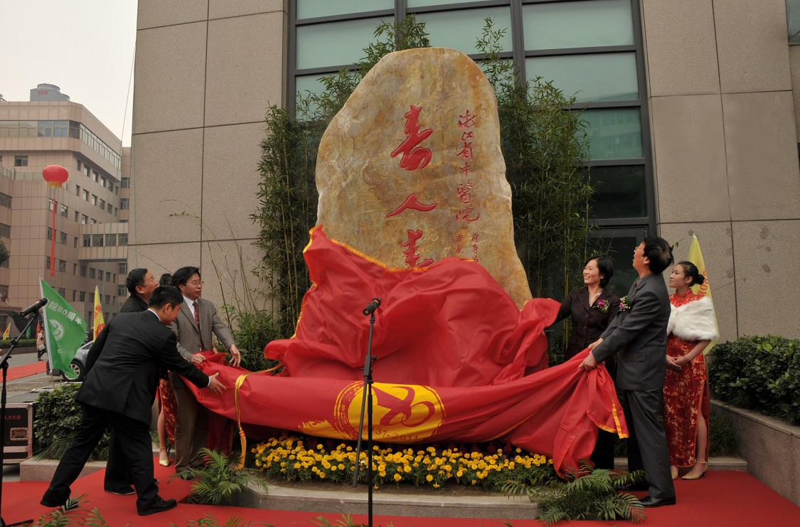 在热烈的掌声和礼炮声中,省人大文教卫副主任肖鲁伟、省卫生厅厅长杨敬、浙江中医药大学党委书记孙秋华、校长范永升为纪念石揭幕。医院院长吕宾在纪念石前发表了热情洋溢的讲话,他表示院庆纪念石的落成,对于我们铭记举医为公的办院理念,发扬“精诚、仁和”的院训有着重要的历史意义。医院自建院以来,始终奉行公立医院的精神,仁心仁术,济世救人。如何将之更好地传承下去,是我们一直以来追求的目标和努力的方向。这次揭幕仪式作为优良传统的深刻教育和精神境界的升华洗礼,将鼓舞全院职工不忘历史、不负重托、不辱使命,身体力行地实践寿人寿世的医学精神,把医院建设成为服务于大众的健康家园。