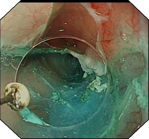 大家都知道,人体胃壁共有四层组织组成:由内到外分别为粘膜层、粘膜下层、肌层、浆膜层。胡妈妈的肿瘤就长在肌层,这是一种良性的胃肿瘤。通常,传统治疗方法一般建议外科手术治疗,开腹或开胸,有时还需要切除食管或者胃的一部分,创伤大,费用高,恢复期长。消化科吕宾教授对患者的检查资料进行仔细的研究分析,在获得患者的知情同意后,决定用国际内镜治疗的最新技术——经内镜粘膜下隧道肿瘤剥离术(STER)切除肿物。STER是通过在距肿瘤近口侧约3-5cm切开粘膜,建立粘膜下隧道(图1),逐步分离组织,显露肿瘤,再沿肿瘤包膜在内镜直视下剥离,完整剥离后取出肿瘤(图2),用金属夹关闭隧道口(图3)。