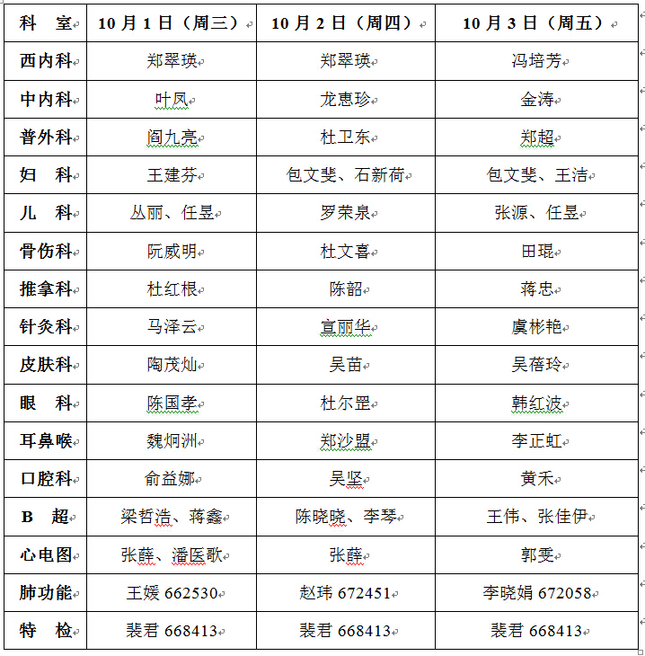 10月3日:神经内科(上)黄玥芳,儿科 董勤、丛丽、陈玉燕、谢翠珠,消化科 张烁,肾病科 于伟