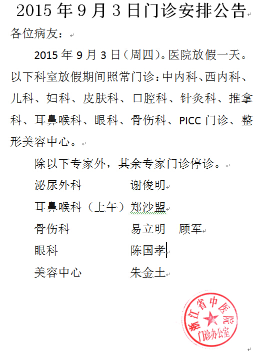 2015年9月3日门诊安排公告