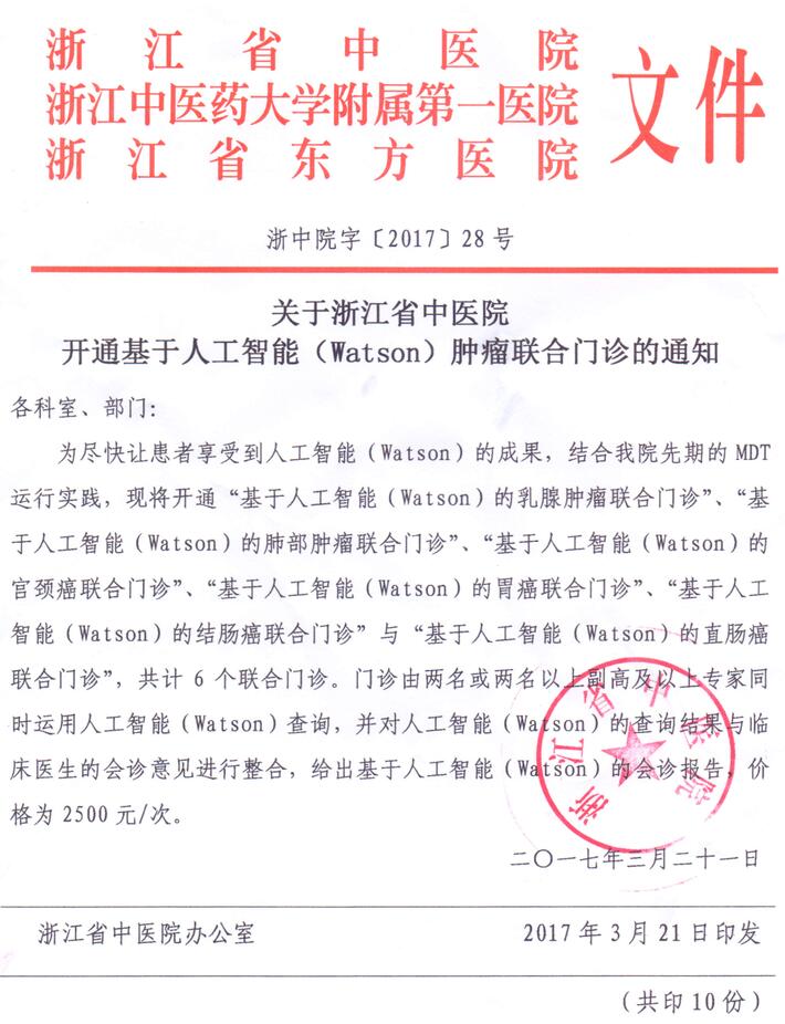 关于开通基于人工智能(Watson)肿瘤联合门诊的通知