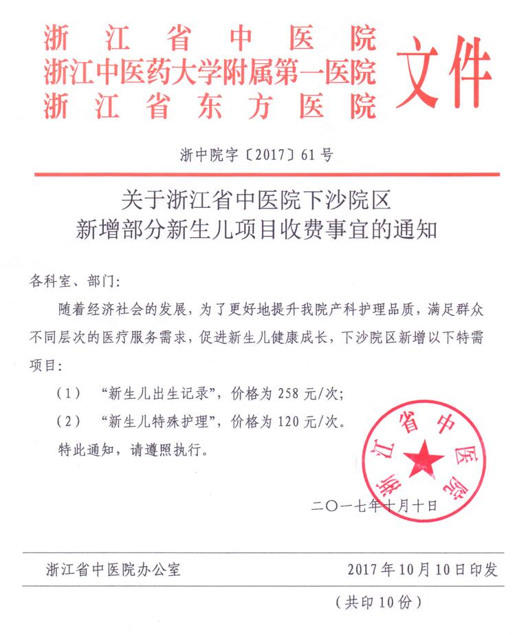 关于浙江省中医院下沙院区新增部分新生儿项目收费事宜的通知