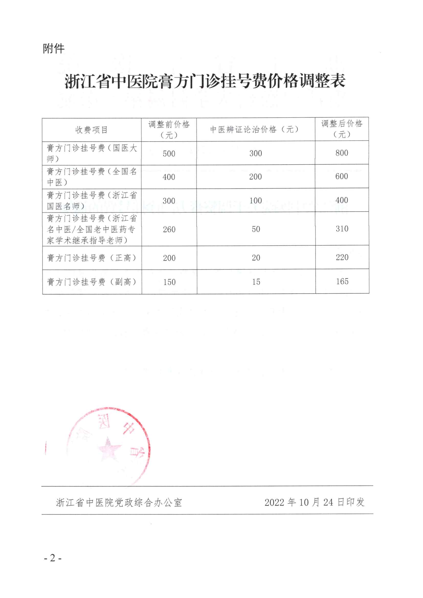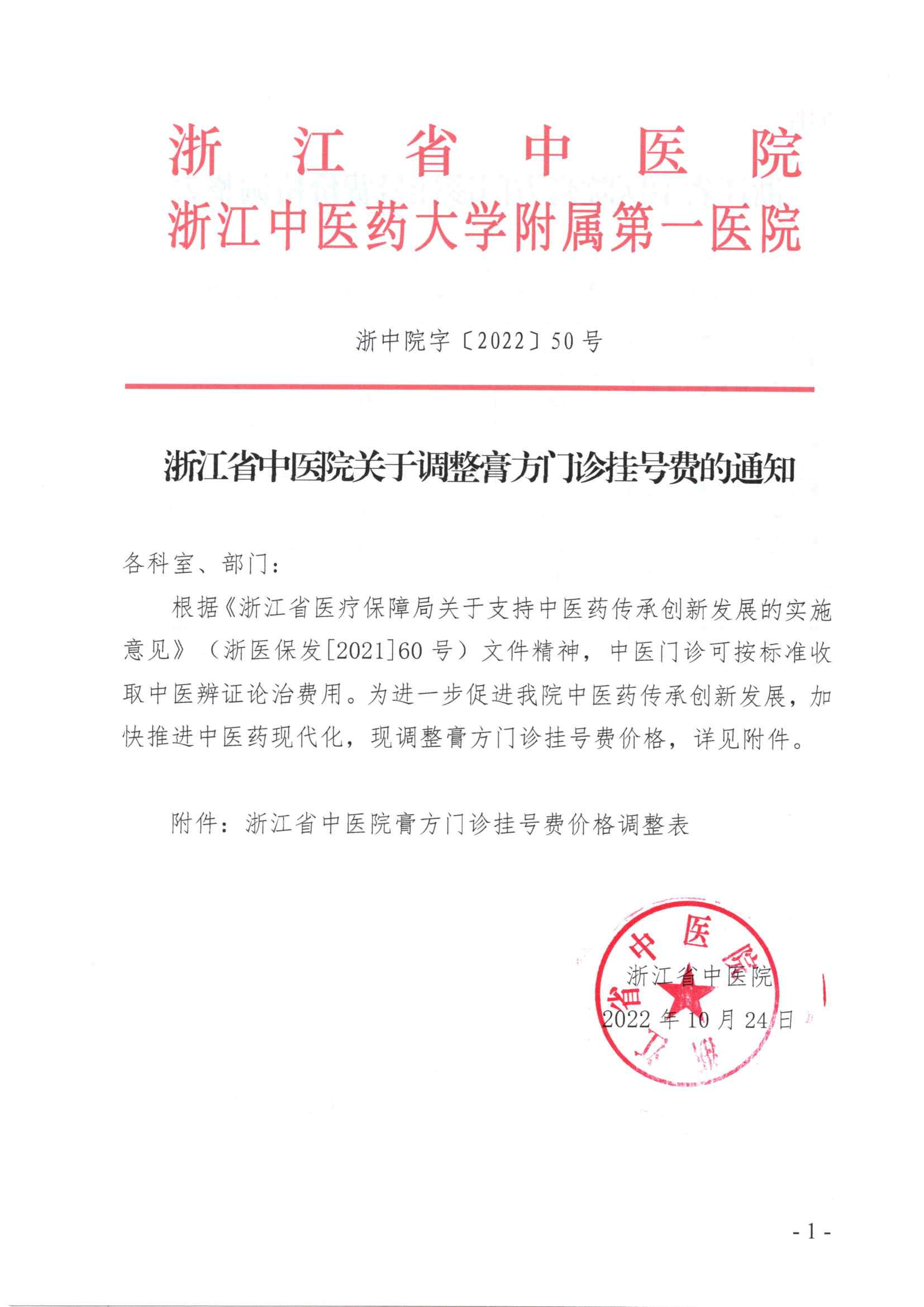 浙中院字〔2022〕50号 浙江省中医院关于调整膏方门诊挂号费的通知