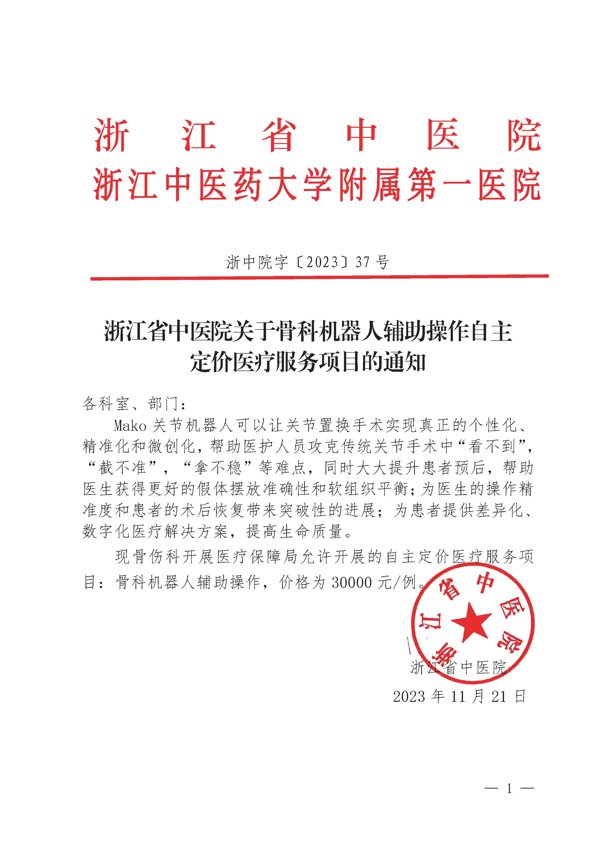 浙中院字〔2023〕37号 浙江省中医院关于骨科机器人辅助操作自主定价医疗服务项目的通知