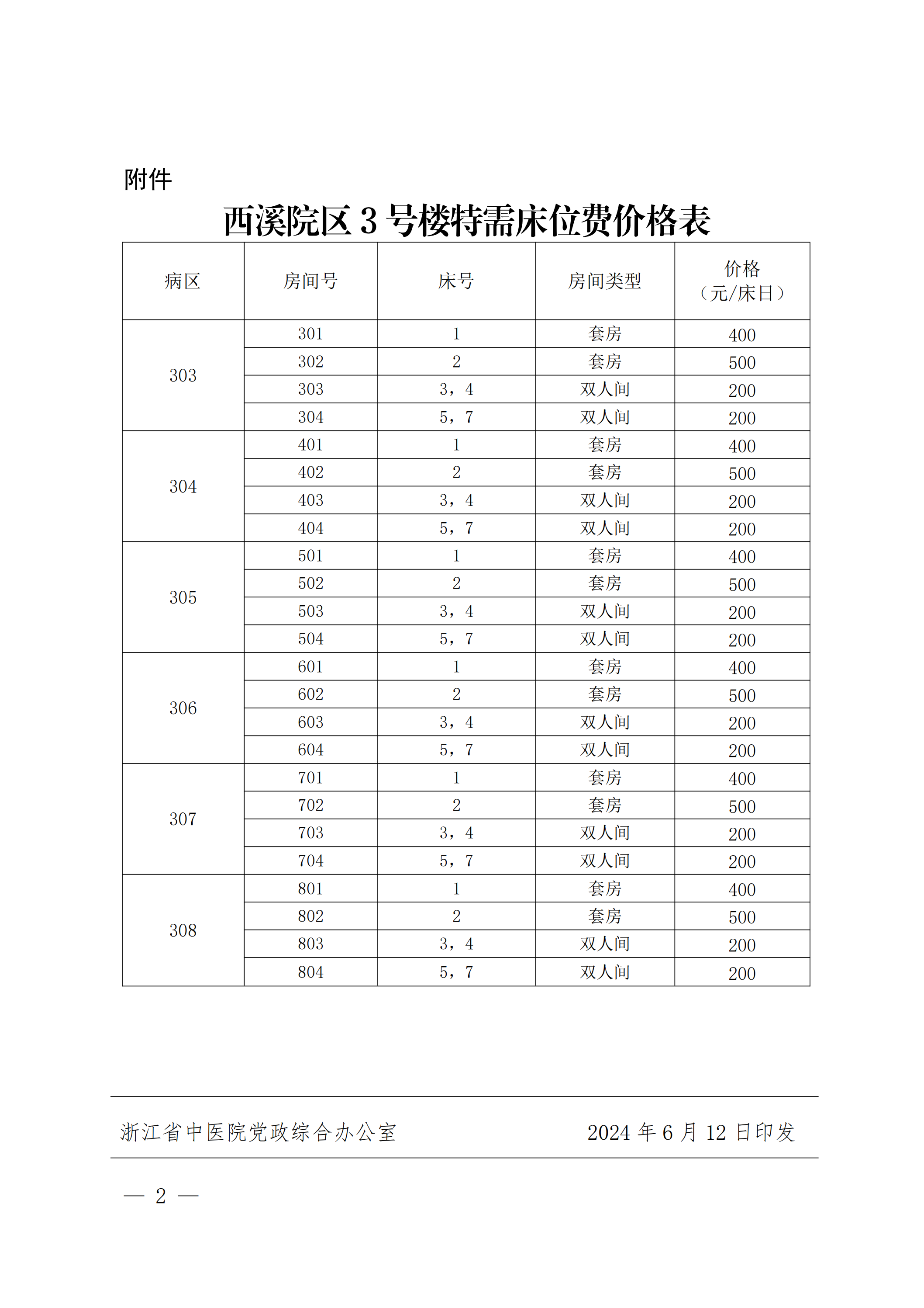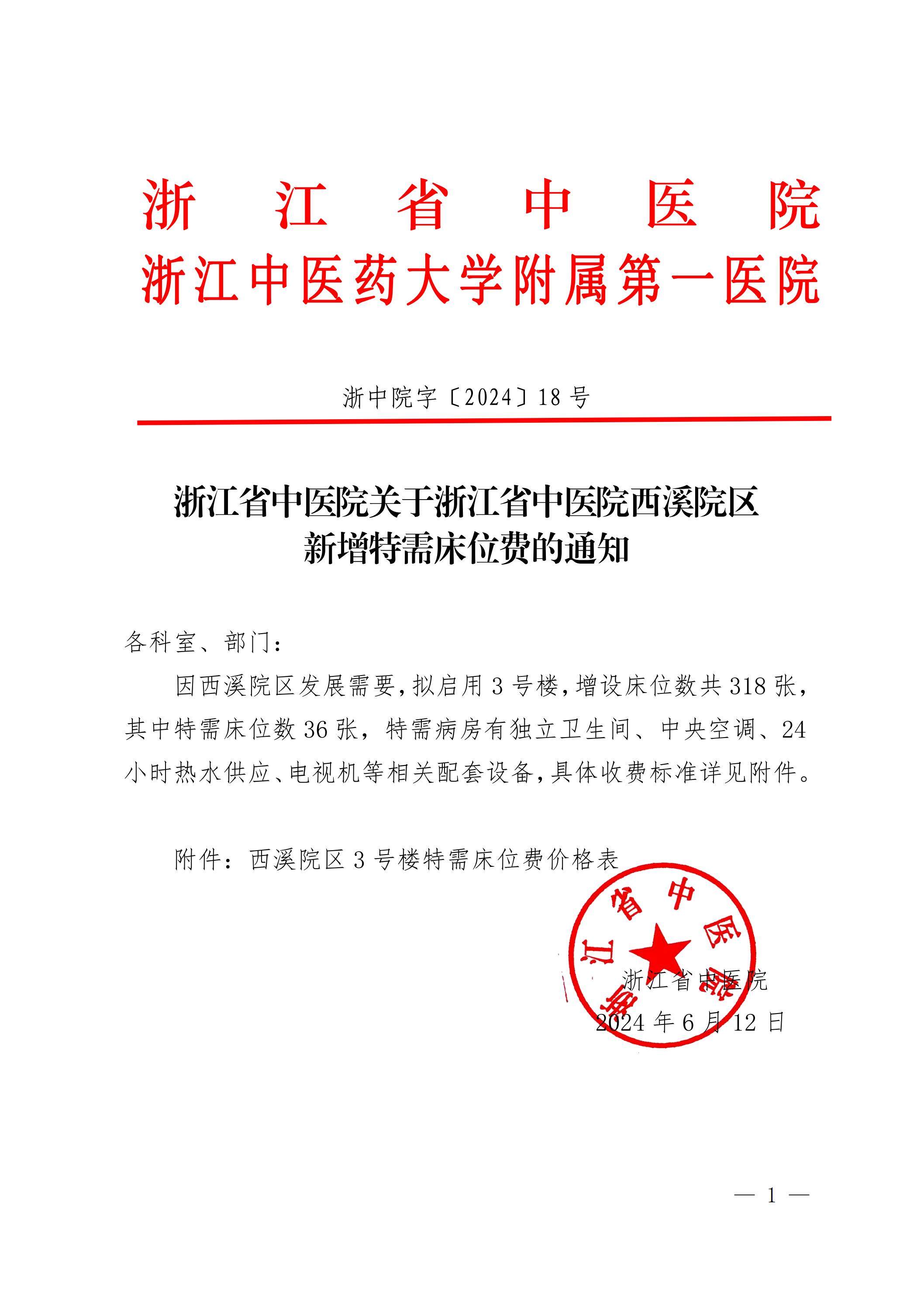 浙江省中医院关于浙江省中医院西溪院区新增特需床位费的通知