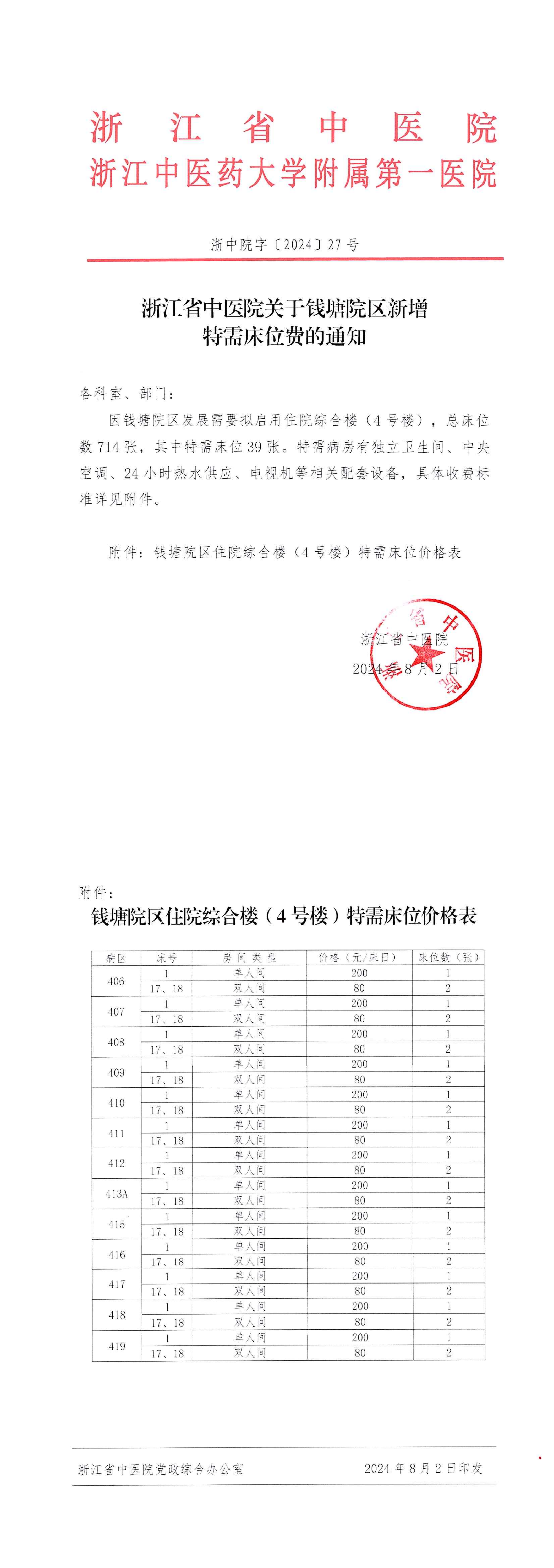 浙江省中医院关于钱塘院区新增特需床位费的通知