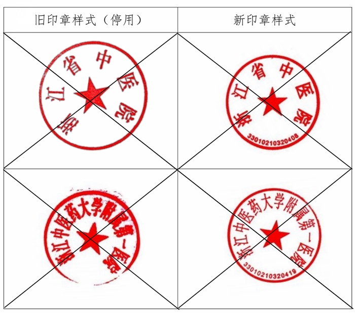 我院因发展需要,已根据相关规定更换新印章,自2024年11月1日起,正式启用新备案的“浙江省中医院”公章及“浙江中医药大学附属第一医院”印章,原公章及印章停用,具体见附件。对于2024年10月31日前已加盖好的原印章文件,不受影响,仍然有效,但后续所有正式文件均需使用新公章或印章加盖方能生效。
