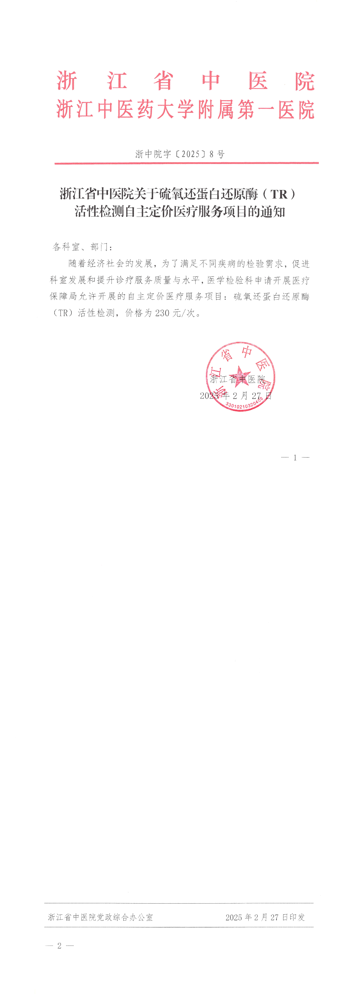 浙中院字〔2025〕8号 浙江省中医院关于硫氧还蛋白还原酶(TR)活性检测自主定价医疗服务项目的通知