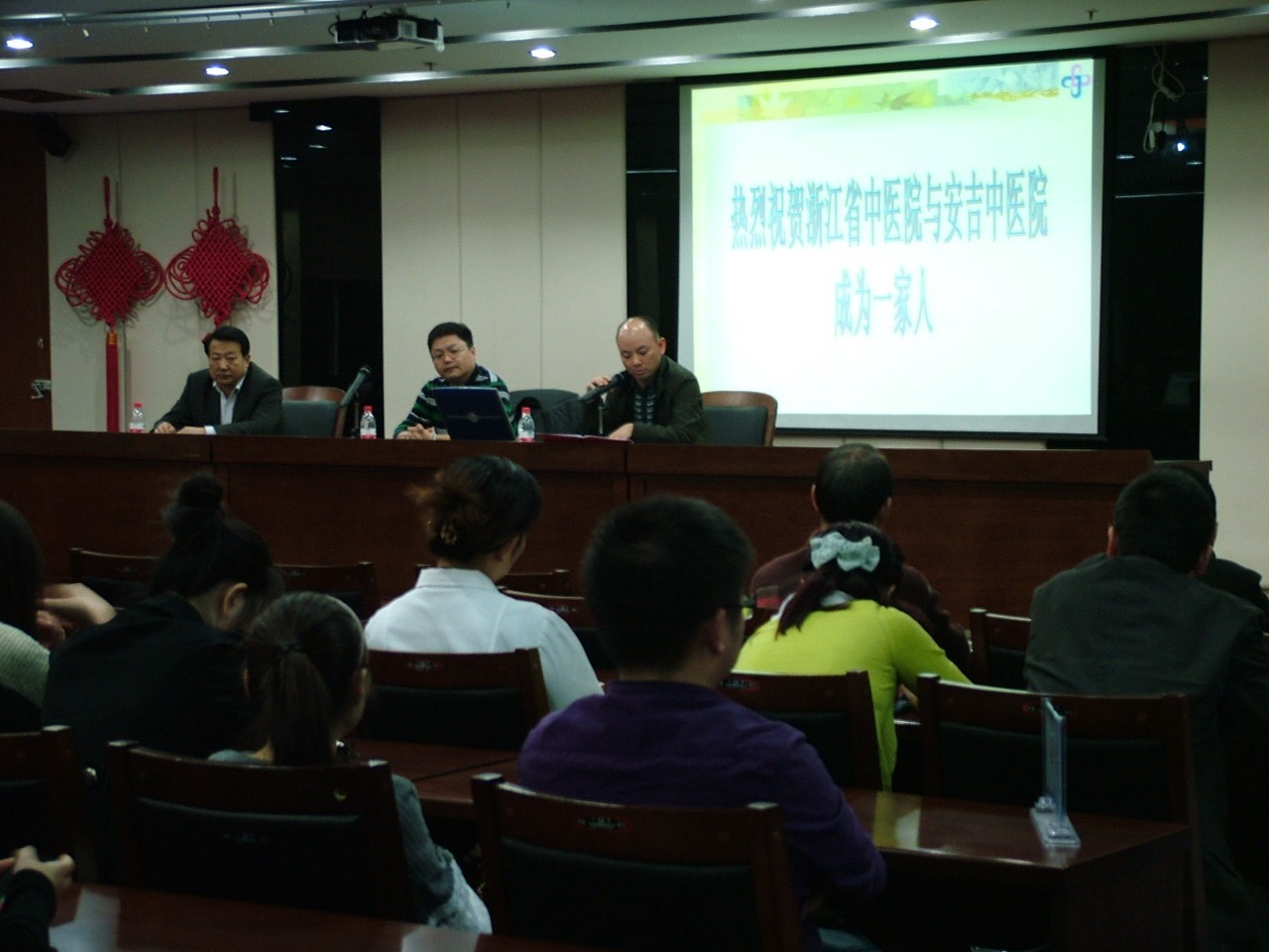 10月31日晚,我院安吉分院(安吉县中医院)可容纳三百余人的学术报告厅内坐无虚席,这里正在召开安吉县中医院全院职工大会?;嵋檎叫颊憬≈幸皆河氚布刂幸皆撼晌?ldquo;一家人”,浙江省中医院医疗助理王慎鸿同志担任该院常务副院长。