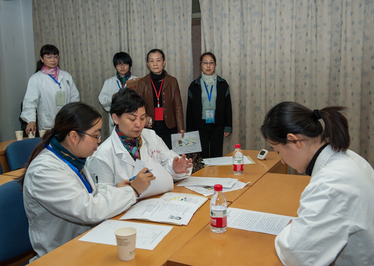 本次考核为“五站式”考核,分为病史采集与体格检查、病例分析、基本技能操作和专业技能操作、病历书写五项内容。通过随机抽检临床病人,采用现场采集病史与体格检查、病历分析与面试提问、模型基本技能和专业技能操作、抽检既往病历并当场评分等方式,对考生进行全面考核。这种“实战”考核真实地反应了考生的临床专业水平,增强了考核的客观性。考试过程中,由浙江省卫生厅委派的巡考官耿晓北、钱燕飞和浙江中医药大学医管处副处长陈华全程巡考。医院按照卫生厅对此次考核的要求配备院内外考官和考务人员,同时医院考务工作小组还为每位考生安排了一名考务人员和志愿者,负责引导考生到各个考站考试,回收考试评分表、考试计时等其他联络工作。这些不仅有力地保障了考核过程的秩序化,而且也体现了考核纪律的严肃性。