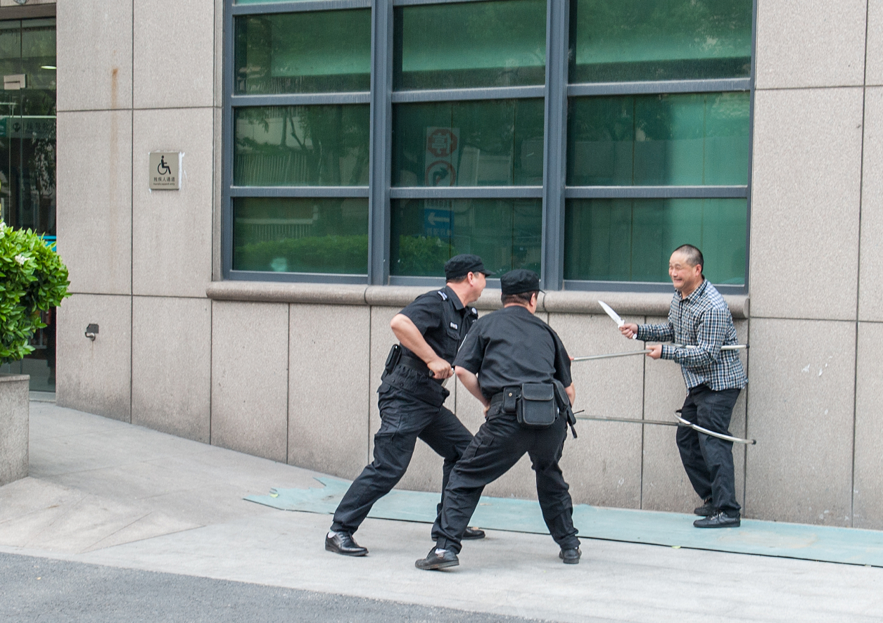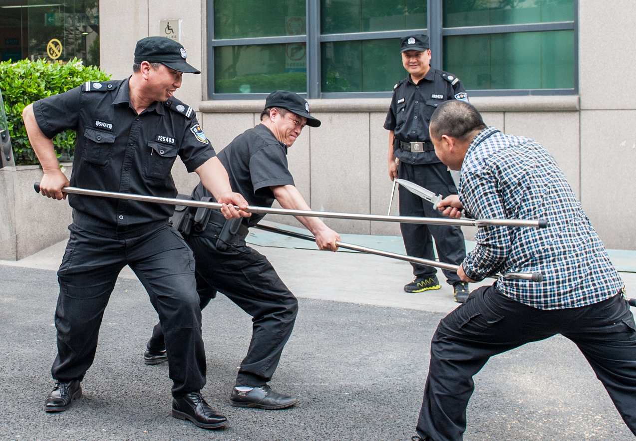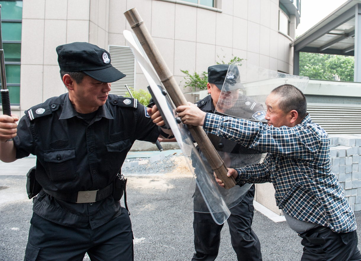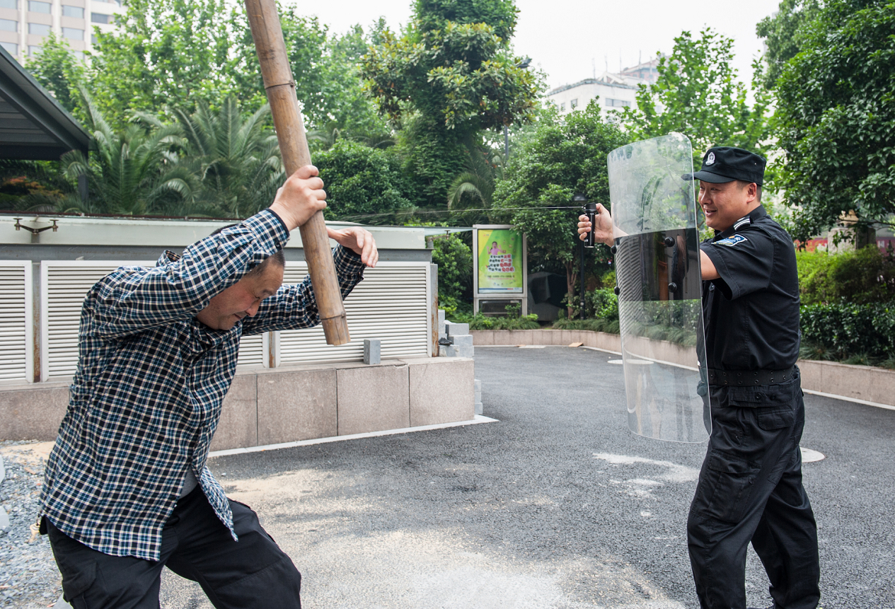 演练中,参演人员运用了保安队伍中现有的防暴器械,开展了“钢叉擒匪”、“盾牌格挡”等项目。通过演练,保安人员学习了不同器械的实际使用效果,增强了面对实际暴力事件时勇敢果断处置的信心和能力。目前医院巡逻安保人员日常工作中配备了武装带、对讲机、伸缩棍、辣椒水,值班室里备置着警盾、防暴钢叉等。