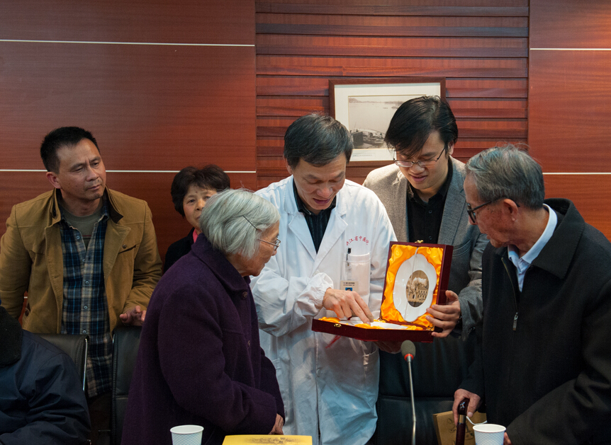 江荣林副院长代表医院向卢奶奶全家赠送纪念礼物