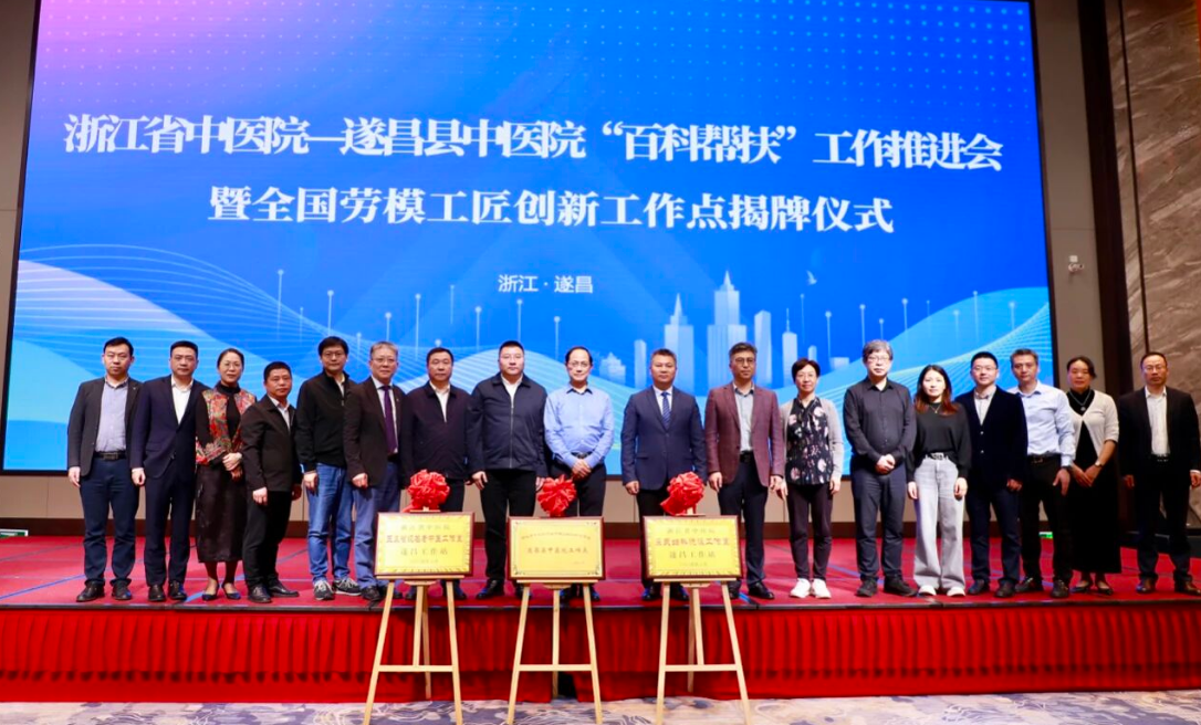 4月13日上午,浙江省中医院-遂昌县中医院“百科帮扶”工作推进会暨全国劳模工匠创新工作点揭牌仪式顺利举行。浙江中医药大学党委副书记张元龙,党委委员、副校长罗伟明,全国劳模、我院党委书记何强,党委委员、副院长林胜友,党委副书记陈智能,遂昌县委常委、常务副县长叶祥根,我院相关职能科室负责人,遂昌县委县政府相关部门、单位代表参加仪式?;嵋橛上馗旄敝魅谓鹬移街鞒?。