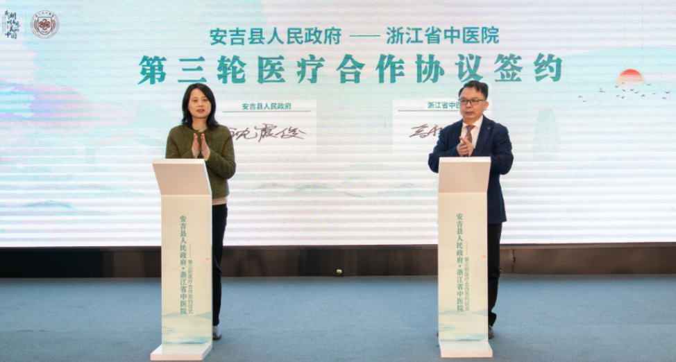 1月12日,我院与安吉县人民政府第三轮医疗合作在安吉分院(安吉县中医医院)正式签约,持续为区域健康事业高质量发展赋能。安吉县委副书记、县长宁云,县委常委、常务副县长沈霞??;湖州市卫生健康委三级调研员、市中医药学会会长朱丽华,湖州市卫生健康委中医处副处长陆周翔;我院党委副书记、院长高祥福,党委委员、副院长林胜友;安吉县委县政府相关部门、单位以及分院领导等出席签约仪式。