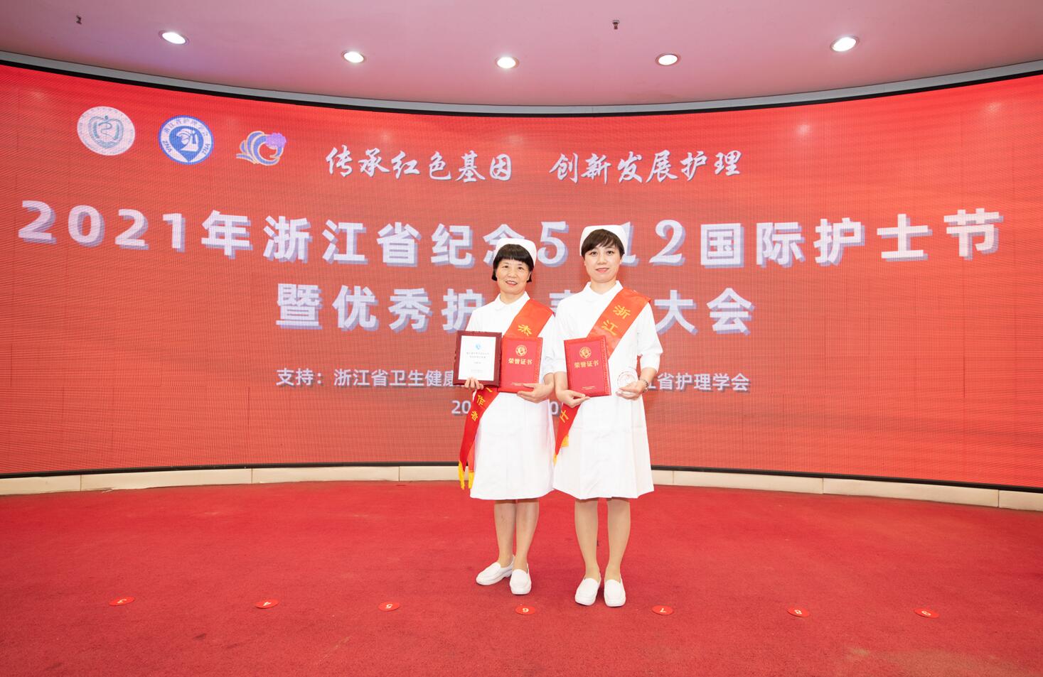 5月10日下午,在第110个国际“5.12”护士节到来之际,浙江省护理学会在杭州举办纪念5.12国际护士节暨优秀护士表彰大会,我院下沙院区护理部主任方桂珍、湖滨院区6病区护士长陈晓洁分别荣获 “浙江省杰出护理工作者”“浙江省优秀护士”荣誉称号,并在表彰大会现场接受表彰。
