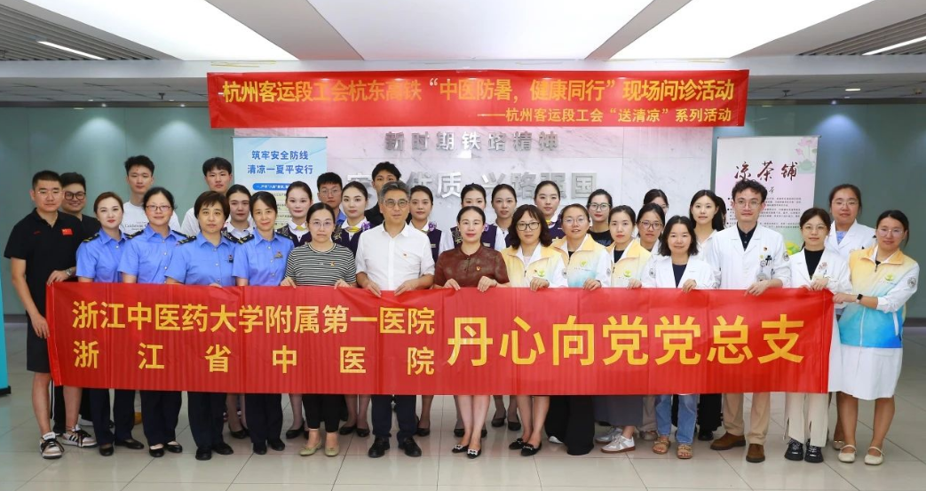 为向奋战在暑运一线的高铁客运职工普及中医防暑知识,增强自我保健意识,23日下午,在医院党委副书记陈智能的带领下,由全科第一党支部等多支部党员组成医护团队走进暑运一线,深入陈美芳劳模工作室开展"中医防暑进高铁、健康服务沁人心"主题义诊暨党建共建活动,为铁路杭州客运段百余名高铁职工提供专业的健康服务。