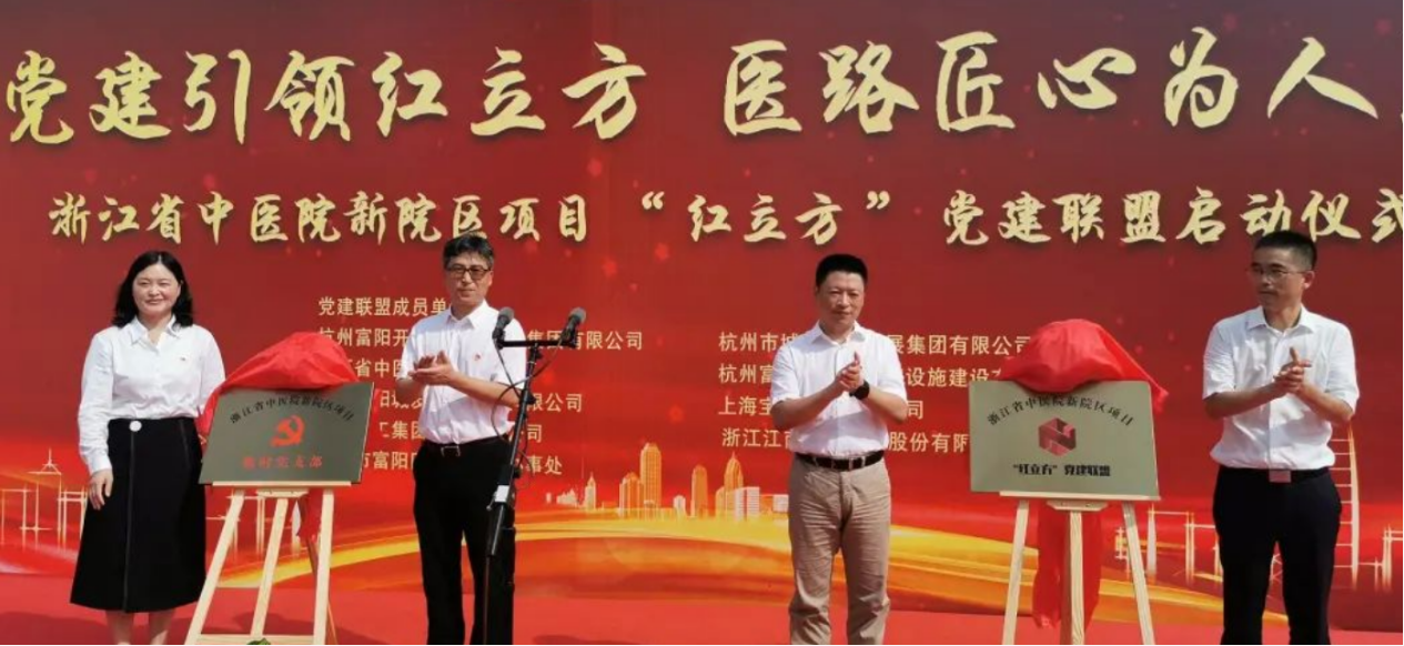 8月27日上午,浙江省中医院新院区项目“红立方”党建联盟启动仪式在项目部现场顺利举行。富阳区区委组织部副部长、区委两新工委书记吴通赛,区财政局党委委员潘小琴,区国有企业党建指导组组长何富军,杭州富阳开发区集团党委书记、董事长赵立群,杭州市城市建设发展集团党委书记胥东,我院党委副书记陈智能等出席启动仪式并为项目“红立方”党建联盟和临时党支部揭牌。我院新院区建设项目办公室及项目参建单位代表80余人参加了活动。