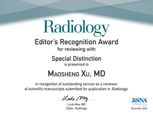 近日,国际放射学领域顶级期刊《Radiology》公布2024年度审稿人评选结果,我院医学影像科许茂盛教授凭借其出色的审稿,荣获“编辑特别评审杰出贡献奖”(Editor’s Recognition Award for reviewing with Special Distinction),在全球众多审稿人中脱颖而出。