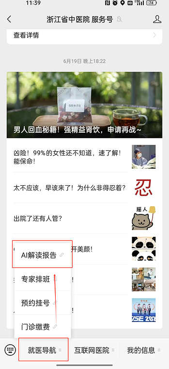 途径:微信公众号“浙江省中医院 服务号”或“浙江省中医院 订阅号”