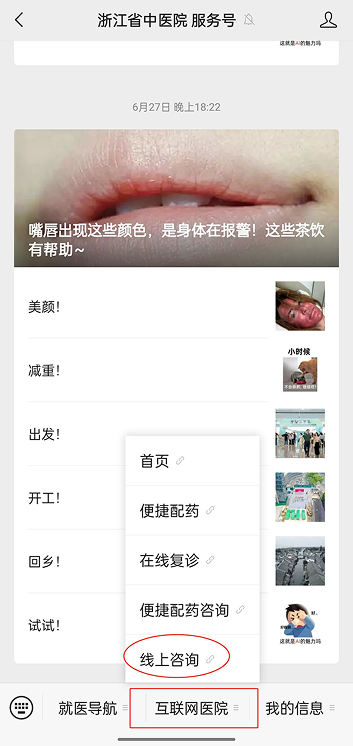 途径:微信公众号“浙江省中医院 服务号”或“浙江省中医院 订阅号”